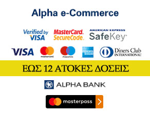 (εώς 12 άτοκες δόσεις) μέσω ασφαλούς διακομιστή της ALPHA BANK. Η διαδικασία εκκαθάρισης της πληρωμής σας αναλαμβάνεται από την ALPHA BANK, εξασφαλίζοντας έτσι την απόλυτη ασφάλεια της συναλλαγής σας. Κατά την εισαγωγή των στοιχείων της κάρτας σας η τράπεζα δεν χρεώνει το ποσό της παραγγελίας σας, αλλά το δεσμεύει. Η χρέωση πραγματοποιείται κατά την τιμολόγηση της παραγγελίας σας. Για την επιπρόσθετη ασφάλεια των ηλεκτρονικών συναλλαγών μέσω πιστωτικών καρτών, αυτές γίνονται με το σύστημα ασφαλείας της Alpha Bank